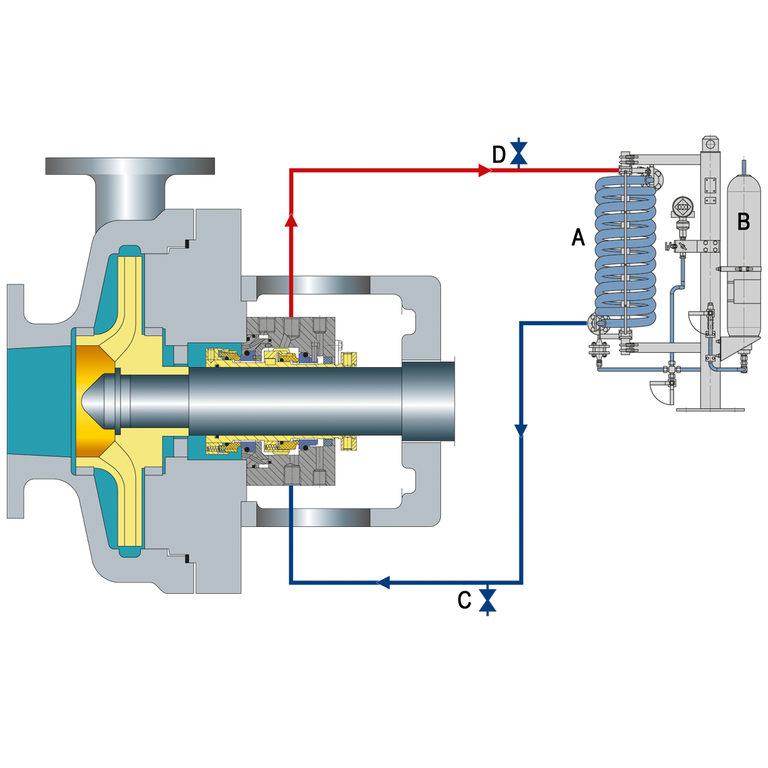 Recirculation from the pump discharge through a cyclone separator delivering the clean fluid to a cooler and then to the seal chamber. The solids are delivered to the pump suction line.