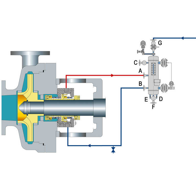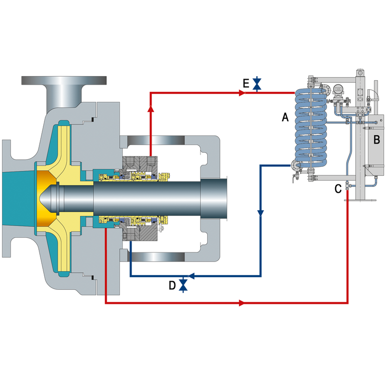 Recirculation from the pump discharge through a cyclone separator delivering the clean fluid to a cooler and then to the seal chamber. The solids are delivered to the pump suction line.