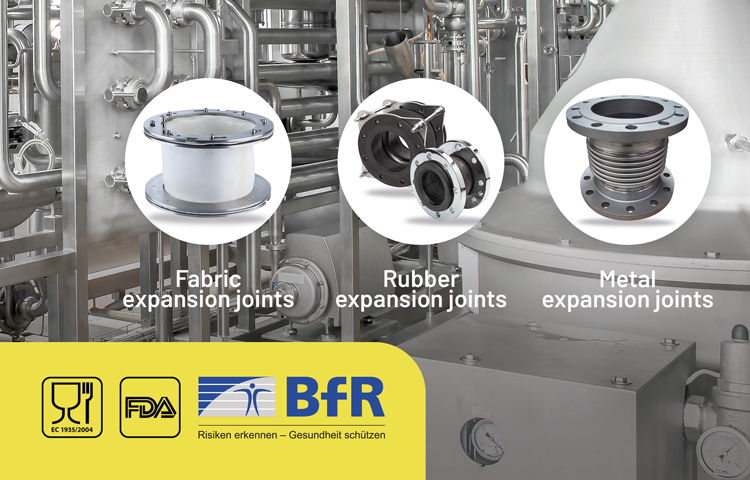 Bellows expansion joints installed as food and beverage processing equipment must be resistant to temperatures up to approximately 300 °C, vibration and chemicals. Other requirements concerning the properties of expansion joints are for example: